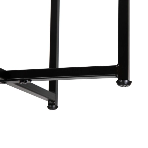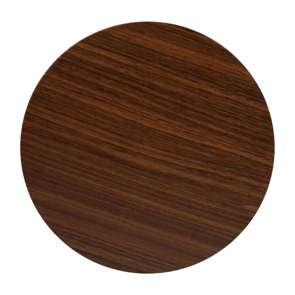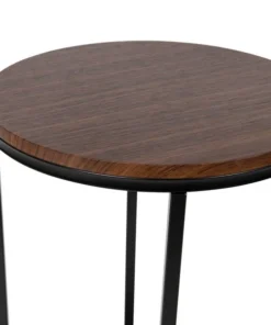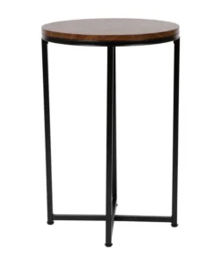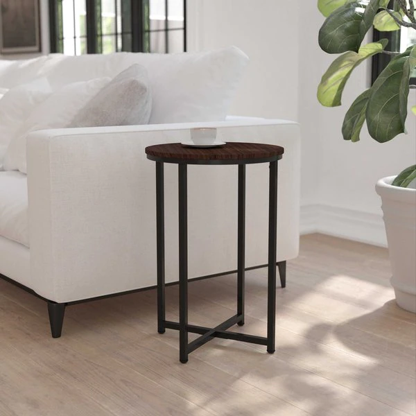 Update the atmosphere in your home with the sophisticated, polished look of this mixed media end table. Featuring a walnut finished laminate top, this occasional table blends seamlessly in any space. The round shape atop modern crisscross matte black metal legs completes the overall look of this stunning piece. Whether you're serving coffee, tea, or just want a place for decorative items, you will never have to worry about the safety of this table. The strong .5 inch thick engineered wood top stands up to daily use while the sturdy cross brace metal frame holds up to 55 lbs. static weight capacity. A durable powder coated finish ensures this living room table will look great for years to come. Have your new end table ready to use in under 30 minutes with the included step-by-step instructions and included tools. Floor glides will protect your hard flooring surfaces from scuffs and scrape and messes clean up quickly and easily with a water based cleaner.