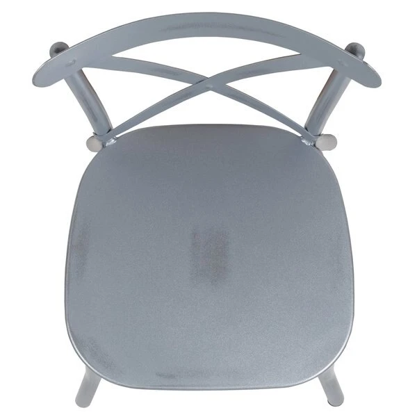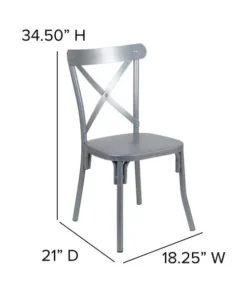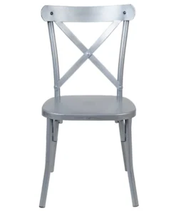 Add a comfortable, welcoming look to your restaurant, bistro or your dining room table with this distressed rustic silver finished metal cross back chair. This versatile chair will work well in any design scheme from farmhouse to open concept to industrial. Pair this X-back chair with any style dining table for a chic, eclectic look that adds a unique design element. Chair arrives fully assembled making setup quick and easy. Ultra-strong, this steel dining chair holds up to 500 pounds to accommodate most users. This cross back dining chair features welded joint assembly for strength and a powder coated frame for long-lasting durability. Plastic floor glides will protect your flooring from damage and ensure smooth movement. Use this chair as a standalone for extra guest seating, add another for a cozy conversation area or purchase enough to fill the spaces around your dining table. Spills clean easily with a water based cleaner. No matter what your design style, this metal X-back kitchen dining chair will be a crowd pleaser.