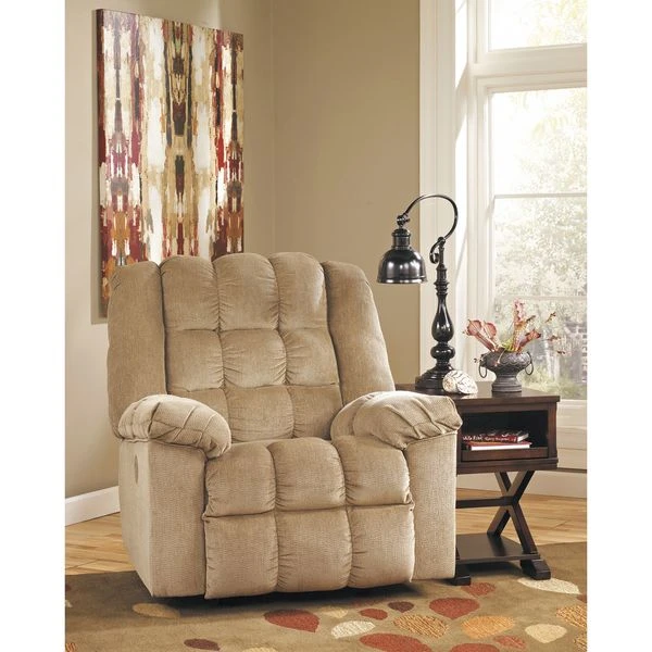 Sit down, kick back and relax in an "easy chair" that's wonderfully easy on the body and the budget. This sand power recliner delights the senses with ultra plush upholstery in a handsomely textured twill. Divided bustle design and puckered stitching meld comfort and style while ample pillow top armrests make it an all-the-more restful place to unwind. Spills and other messes can be taken care of with a water-based cleaner. With one-touch power control, you've got an infinite number of ways to recline at your fingertips. Drape a throw blanket over the back and add a soft decorative pillow to have the ultimate comfort oasis.