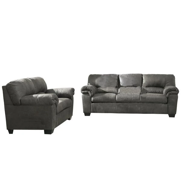 If you love the cool look of LeatherSoft but long for the warm feel of fabric, you'll find the slate faux leather upholstery on this sofa set fits the bill beautifully. Rest assured, the textural, multi-tonal upholstery is rich with character and interest, while plush, pillowy cushions merge comfort and support with a high-style design. Ample padded arms are desirable for curling up on to take a mid-afternoon nap. Take care of spills or other messes with a water-based cleaner. The durable design will add warmth and presence to your living room, den or basement.