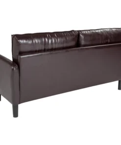 The sleek design of brown sofa with extended side panels will add a stylized look to your home furnishing. Oversized back cushions are removable for cleaning and have a hook and loop system to keep cushions in place. Soft and durable LeatherSoft upholstery adds warmth and comfort. Keep floors dust free with high legged furniture that makes it easier to sweep or vacuum underneath. Clean up spills and other messes with a water based cleaner. For your library or den, having two chairs makes an easy conversational setting. Whether you use in your home library or living room, the plush cushions and padded track arms will have you cozied up.