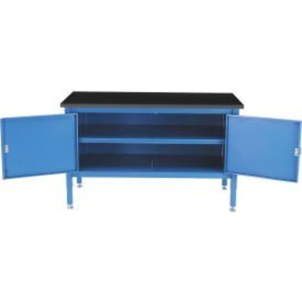 EXTRA HEAVY DUTY SECURITY CABINET BENCHES SAFETY EDGE PHENOLIC RESIN TOP THESE CABINET BENCHES ARE ENCLOSED WITH HEAVY GAUGE STEEL TO PROVIDE SECURITY FOR ALL YOUR UNDER BENCH TOP STORAGE NEEDS. HIGH QUALITY, INDUSTRIAL WORK BENCHES ARE MADE TO LAST USING RUGGED 2" SQUARE, 14 GAUGE TUBULAR STEEL LEGS THAT ARE HEIGHT ADJUSTABLE 28-34"H AT 2" INCREMENTS. THESE WORKBENCHES OFFER 5000 LB. CAPACITY . 1" THICK CHEMICAL RESISTANT PHENOLIC RESIN TOP WITH STANDARD SAFETY EDGE. CABINETS INCLUDE CUT RESISTANT PADLOCKABLE HASP FOR SECURITY (PADLOCK SOLD SEPARATELY). INTERIOR COMPARTMENT MEASURES 25-1/2"D X 22"H. CENTER SHELF SOLD SEPARATELY. INCLUDES ADJUSTABLE LEVELING FLOOR GLIDES AND LEVELING FOOT PLATES THAT ALLOW FLOOR ANCHORING . OFFERS CLEARANCE SPACE UNDER CABINET. POWDER COAT FINISH. QUICK AND EASY ASSEMBLY.