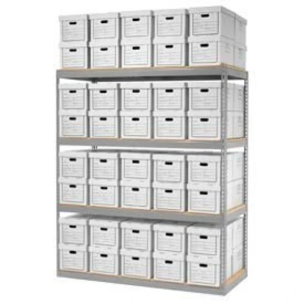 RECORD STORAGE CENTER RUGGED, ROOMY 200 TEST CORRUGATED TRANSFER FILE WITH DOUBLE-THICK FRONT/BACK WALLS HELP KEEP RECORDS PROTECTED AND NEATLY ORGANIZED…KEEPS OUT DUST AND DIRT. LARGE PRINTED LABEL AREA FOR QUICK IDENTIFICATION OF CONTENTS AND HAND HOLES FOR EASY HANDLING. BOXES STORE SECURELY ON RUGGED 5/8" THICK PARTICLEBOARD DECKS. HEAVY-GAUGE STEEL RACK ASSEMBLES WITHOUT TOOLS.