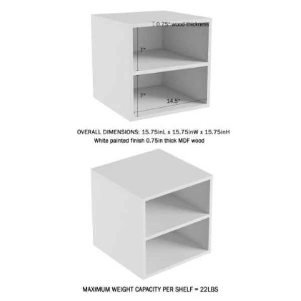 The 2-Shelf Cube End Table from Hastings Home holds up to 22-pounds on each shelf while the open design offers storage space for books, collectibles, photo frames and accent pieces. This versatile contemporary looking modular cube can be used as an end table, alongside a second unit to create a coffee table, or stacked to create a shelf using braces (not included). Constructed of durable MDF wood with a chic white veneer, this durable side table assembles in minutes with the provided hardware and will be ready to enhance your living room, office, bathroom, bedroom and more – the possibilities are endless!