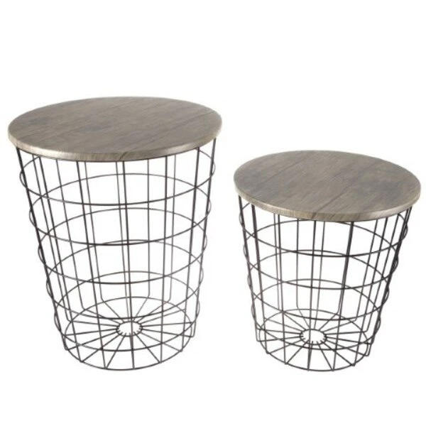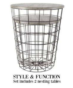 The Wire and Wood Nesting End Table Set from Hastings Home includes two wire basket style bases that can be used as a minimalist display or convenient storage and are topped with wooden lids to create a functional tabletop. The brown metal bases can be filled with decorative accents, used to store throw pillows or blankets, and can also be packed with large toys in a kid's room to keep it tidy. The set of nesting tables come in two different sizes and have durable MDF wood tabletops with a gray woodgrain veneer that will complement rustic industrial or modern farmhouse decor in your living room, office, bathroom, bedroom and more – the possibilities are endless!