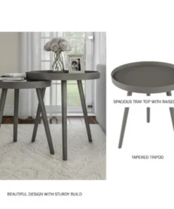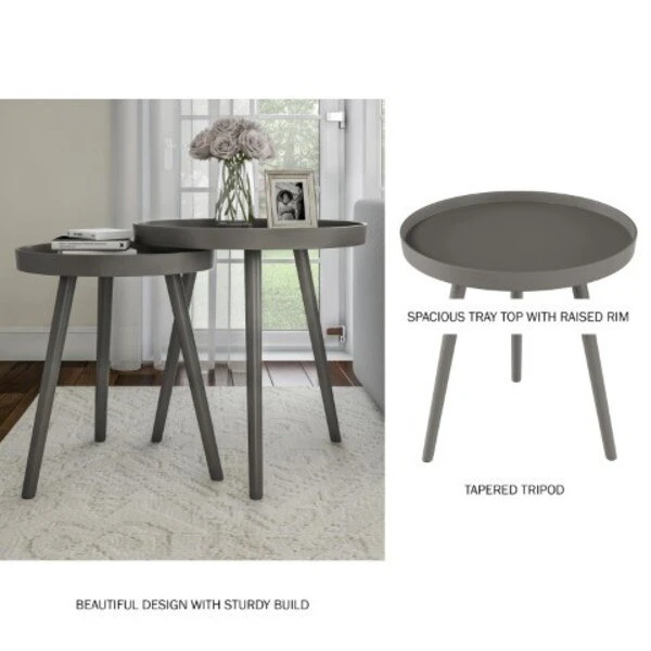 Bring the best of style and function to your home with the Nesting End Tables by Hastings Home. The modern, clean lines of this pair of accent tables bring a chic, updated mid-century modern style to your home. The tables are constructed from sturdy manufactured wood that support a 22-pound weight capacity and the raised lip of the tray tops helps keep lamps, potted plants and more, safely in place. Each tapered spindle leg features a soft foot pad to protect your floors from damage. The end tables assemble in minutes without the need for tools! They can be taken apart when not in use for convenient storage, making them ideal for dorms and small apartments. These accent tables come in a set of two, so you can use them as furniture, snack trays, plant stands or as a statement piece.