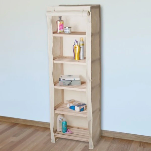 The 5 Tier Wooden Shelf with Removable Cover makes storage easy and attractive. Perfect for bathrooms, bedrooms, kitchens, closets, or remove the tie-on cover and use as a display or book shelf. Easy open and close cover helps keep your toiletries or clothing private.