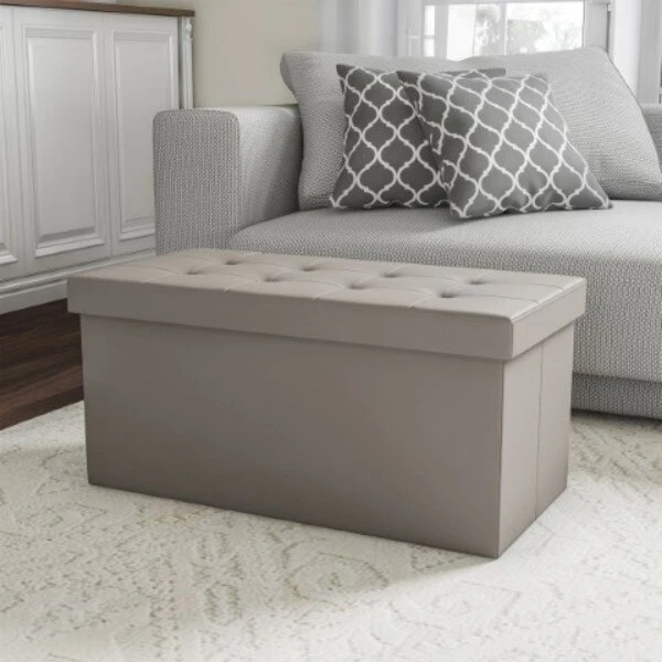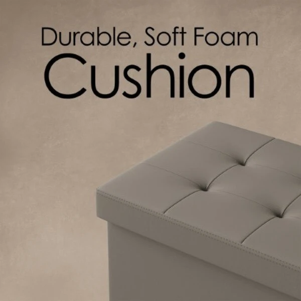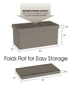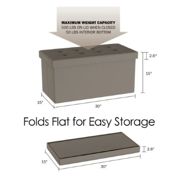 Bring the best of style and function to your home with the Folding Storage Bench Ottoman by Hastings Home. This comfortable bench features a premium synthetic leather cover and plush foam padding on the lid for ample seating comfort. This storage trunk is constructed from sturdy MDF material to give it a 500-pound weight capacity as a seat and 50-pound capacity as a storage cube. The collapsible design makes it easy to set up and can be folded flat when not in use for convenient storage, making it ideal for dorms, RVs and small apartments. The removable inner bin provides extra storage and organization options. This multipurpose storage trunk is great to use as a footrest, bed stool, toy chest, coffee table and more. The modern, clean lines and tufted design bring a chic style to your home and functional charm to any bedroom, living room or utility room while keeping your belongings organized.