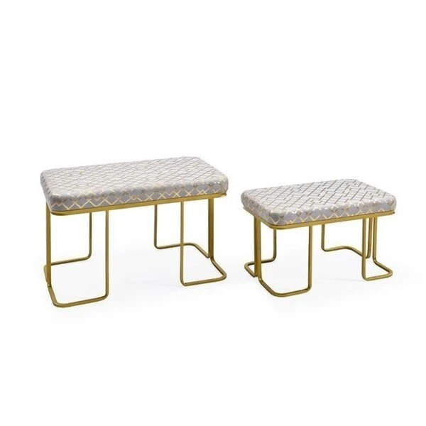 The Hodedah 2 Piece Grey-Gold Fabric Upholstered Ottoman is multifunctional yet chic so you'll never have to sacrifice one for the other. This two piece bench will glamourize your entry way when used as a bench or living room when used as an ottoman. Its geometric pattern creates a modern play whilst its minimalist base makes your space feel airy. Designed with space-saving efficiency these benches can be stored one underneath the other when not in use. The perfect solution when those unexpected guests arrive. you can be sure there will be enough seating for everyone. As a bonus these accent benches arrive assembled ready for enjoyment. FeaturesGeometric Fabric Upholstered Ottoman2 PieceSpecificationsColor: Grey & GoldDesign: GeometricWeight: 27.55 lbs