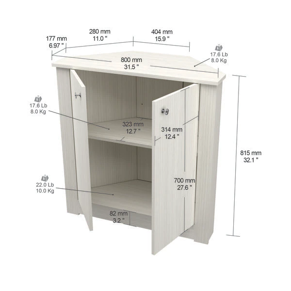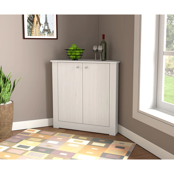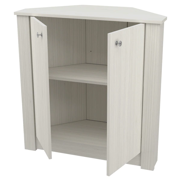 1 Shelf Corner Storage Cabinet by Inval®, finished in a rich “Washed Oak” laminate. This storage cabinet features two (2) wide cabinet doors which conceal ample storage space and feature 2 shelves, 1 height adjustable. The doors have stylish brushed metal knobs. The unit can be placed in any corner of your home or office providing you with additional storage space and decor display. Constructed from manufactured wood laminated on both sides with durable melamine which is stain, heat and scratch resistant.