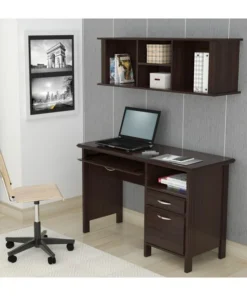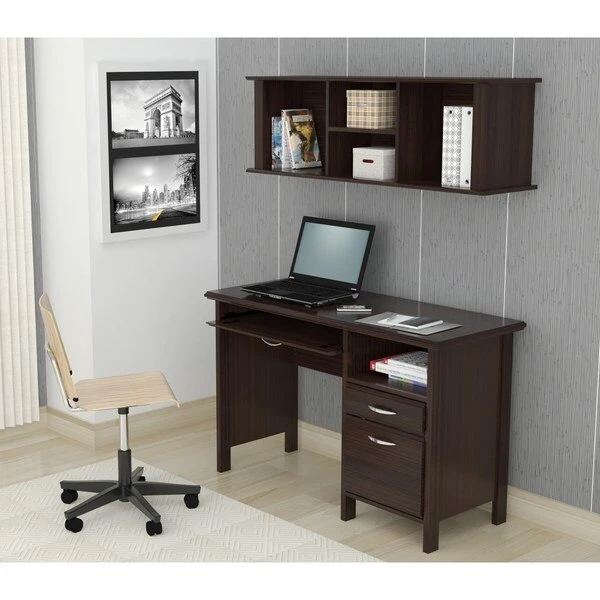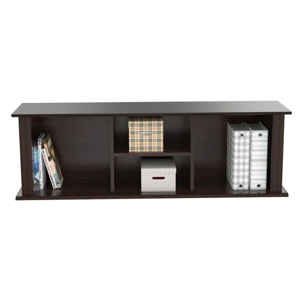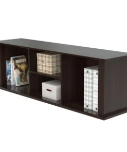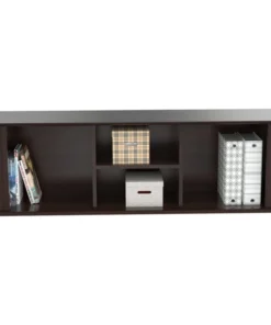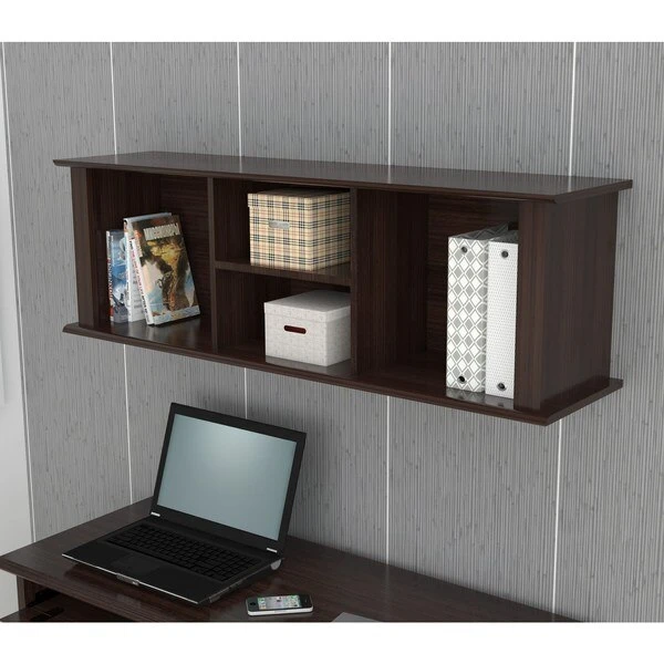 Wall-Mounted Hutch by Inval® finished in a rich “Espresso” laminates in durable melamine which is stain, heat and scratch resistant. This wall mounted hutch has a functional modern design and is an excellent choice for home office or office. It features two horizontal shelves in the center and vertical storage area on each side providing ample storage space.