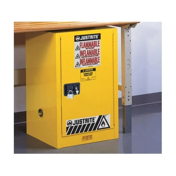 Hazardous storage cabinets are used to store. organize. and segregate safety cans containing flammable or hazardous liquids. Some cabinets are made of galvanized steel and are double-walled to reduce the risk of fires. Others are made of polyethylene. which is resistant to certain acids and corrosive liquids. Cabinets may have standard hinged doors that close manually or self-closing hinged or sliding doors that close automatically.They can be color-coded – yellow for flammables; red for combustibles; blue for corrosives; green for pesticides; silver or light neutral for laboratory materials; and white or gray for other waste or outdoor lockers. Certain cabinets are FM Approved and meet National Fire Protection Association (NFPA) and Occupational Safety and Health Administration (OSHA) standards for the storage and handling of flammable liquids. Hazardous storage cabinets are used in a variety of commercial and industrial environments and can also be suitable for home use.They can be color-coded – yellow for flammables; red for combustibles; blue for corrosives; green for pesticides; silver or light neutral for laboratory materials; and white or gray for other waste or outdoor lockers. Certain cabinets are FM Approved and meet National Fire Protection Association (NFPA) and Occupational Safety and Health Administration (OSHA) standards for the storage and handling of flammable liquids. Hazardous storage cabinets are used in a variety of commercial and industrial environments and can also be suitable for home use.FeaturesSafety cabinet has one self-closing door and can be used to store safety cans containing flammable liquids.Door closes automatically to help keep flammable or hazardous liquids securely contained and meet certain local. state. or federal fire codes.Made of 18-gauge galvanized steel. which is resistant to rust. dents. and certain chemicals; double-walled to reduce fire risk; yellow powder-coated finish resists wear.Each adjustable shelf can hold up to 350 pounds; slopes slightly to direct spills to the back of the cabinet.Meets OSHA Standard 1910.106 and NFPA Code 30 for the safe storage and handling of flammable liquids.Capacity – 12 gallon.1 shelf.1 Self Close door.Color – Yellow.