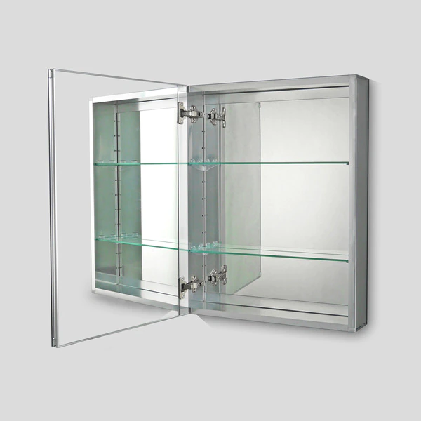 Our medicine cabinets provide elegant solutions to your bathroom storage needs. Constructed of brushed satin anodized aluminum, these cabinets combine luxury with a no maintenance finish. Interior and exterior mirrors are set in a superior solid aluminum door construction. Slotted finger pull along the edge and underside of the door allows for easy function. Soft close gravity hinge operation. The cabinets can be installed both recessed and surface mounted. Floating mirrored side kits and hardware are included for either installation.