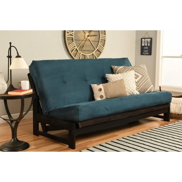 The futon is a classic hardwood frame with a space saving design. This unique and versatile full size futon sofa easily converts to a Bed. This multifunctional piece of furniture can find a home in just about any type of room. FeaturesSolid hardwood constructionConverts to standard full size bedNo tools needed for easy assemblySpace saving designPlantation grown hardwoodSit. lounge. and sleep postionIncludesFrame. MattressSpecificationsFabric Color: BlueSecondary Color: Blue. Suede NavyFrame Color: Reclaimed MochaFabric Content: 100% PolyesterMattress Specs: 276 Coil Hinged Spring. Cotton. High Density Foam. Hand TuftedBed Size: Full SizeMaterials: Wood and FabricSeat Height: 20"Seat Depth: 21"Seat Width: 74"Mattress Dimension(in.): 75L x 54W x 7HFrame Dimension(in.): 76L x 31D x 37HWeight: 75 lbs