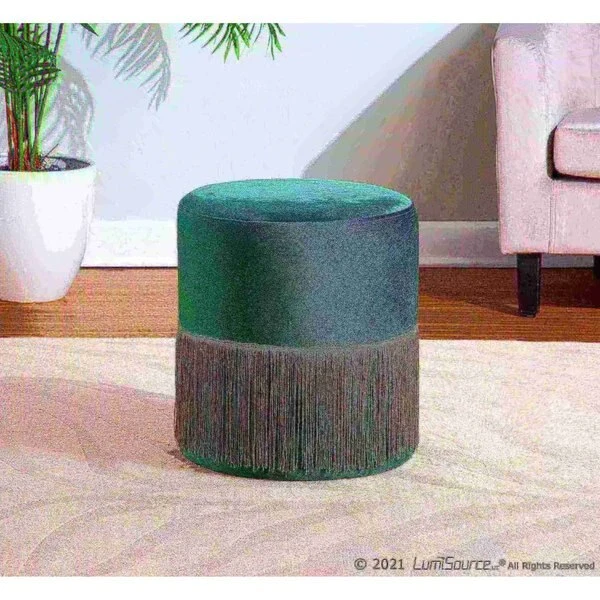 A stunning addition to almost any area, the by LumiSource is an accent piece with attitude. With a comfortable velvet upholstered seat and fringe detail, this ottoman provides a touch of luxury to your home. Customize by choosing from available fabric color options.