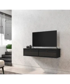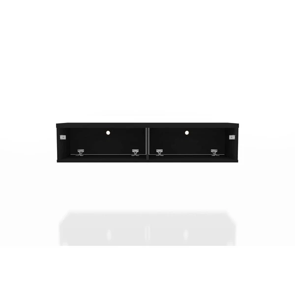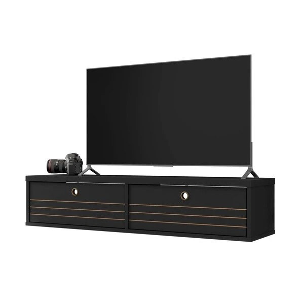 Seamless, functional, and a bit industrial chic, the Liberty floating entertainment center makes entertainment easy and stylish. Two concealed drop-down shelves perfect for tucking away media accessories, books, DVD players, and more. This piece is both practical for a smaller or larger space, with clean lines, display space, and smart design.