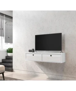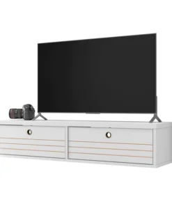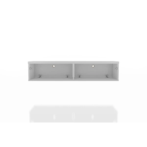 Seamless, functional, and a bit industrial chic, the Liberty floating entertainment center makes entertainment easy and stylish. Two concealed drop-down shelves perfect for tucking away media accessories, books, DVD players, and more. This piece is both practical for a smaller or larger space, with clean lines, display space, and smart design.