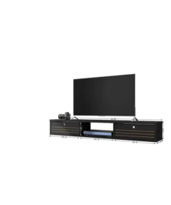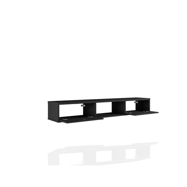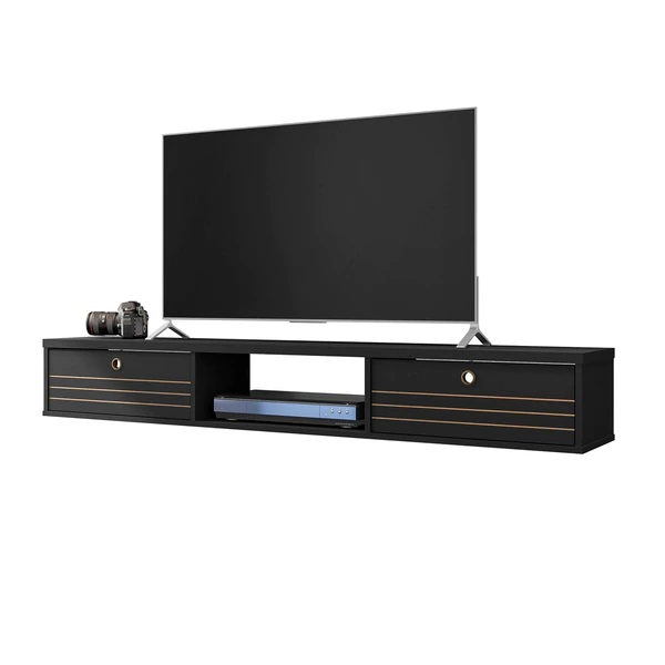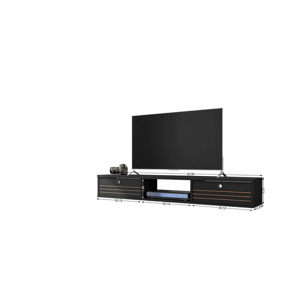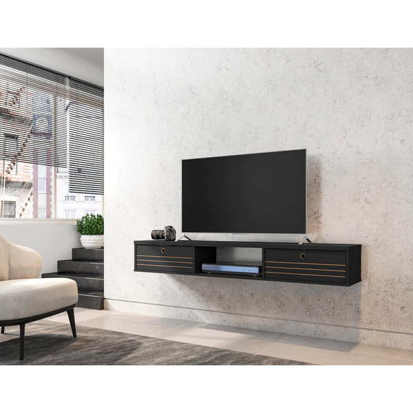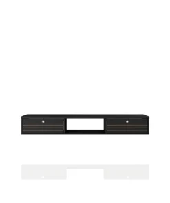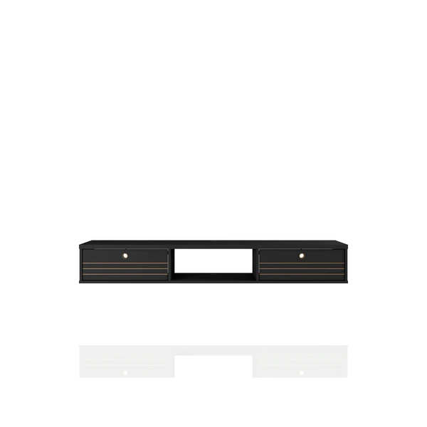 Seamless, functional, and a bit industrial chic, the Liberty floating entertainment center makes entertainment easy and stylish. Two concealed drop-down shelves and center open shelving are perfect for tucking away media accessories, books, DVD players, and more. This piece is both practical for a smaller or larger space, with clean lines, display space, and smart design.
