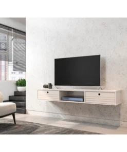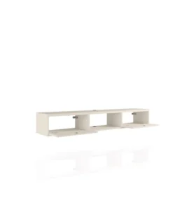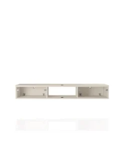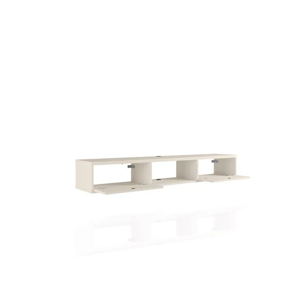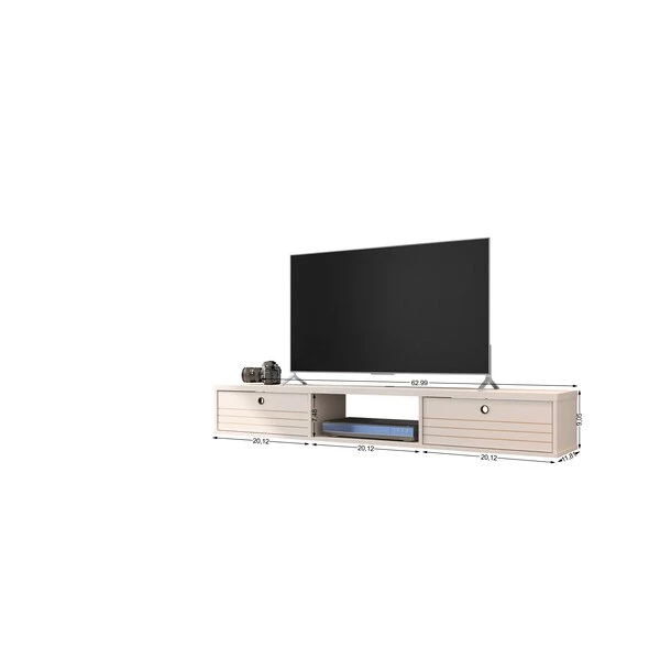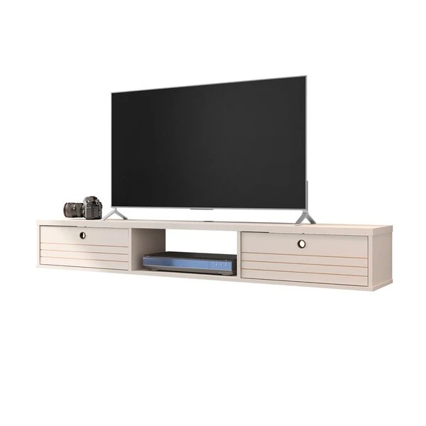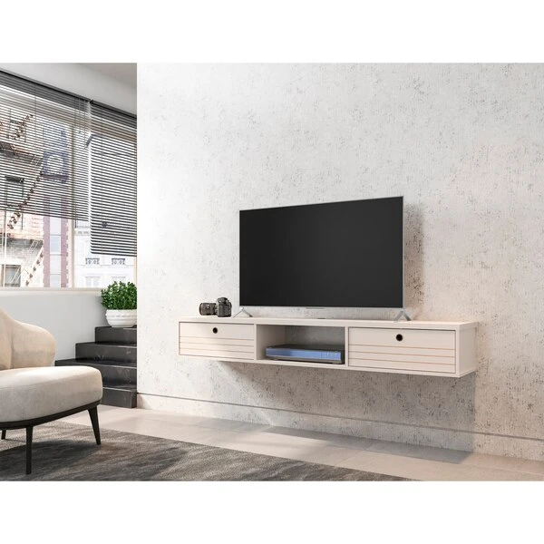 Seamless, functional, and a bit industrial chic, the Liberty floating entertainment center makes entertainment easy and stylish. Two concealed drop-down shelves and center open shelving are perfect for tucking away media accessories, books, DVD players, and more. This piece is both practical for a smaller or larger space, with clean lines, display space, and smart design.