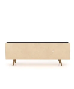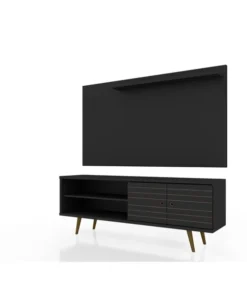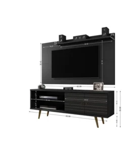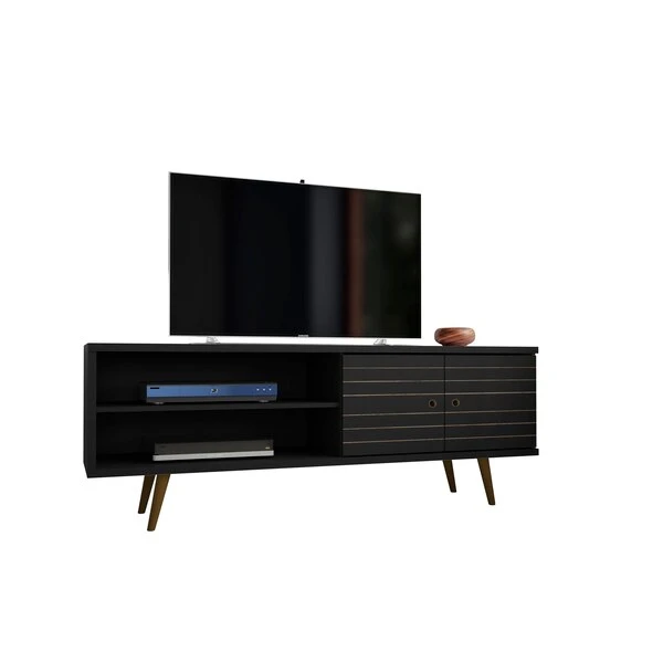 The 2-Piece Liberty 62.99 Mid-Century Modern TV Stand and Panel is a high quality, beautifully crafted, functional unit. Featuring two open shelves, and one large concealed compartment perfect for stashing DVDs, board games, electronics, and media accessories, this entertainment center is the ultimate gathering place and will create a statement in any space. Artful grooves mix well with any decor and splayed wooden legs add character and ease for moving. TV Panel includes overhead shelf perfect for family photos, collectible, and décor items.