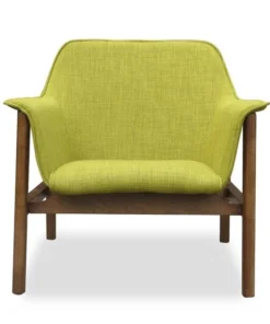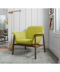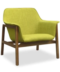 Bring extra fun to your family room. Reminiscent of classic Mid Century Americana, this wood accent chair combines organic contours with structured angles for a delightful statement look. The unique construction features a curved, flared, seamlessly upholstered seat, which is cradled within an architectural scaffold-style frame. The rich walnut finished wood and earth-tone upholstery are practical and irresistibly welcoming, adding immediate personality and warmth to your living space.