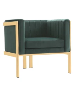 Lounge in 1920s luxury. This sophisticated accent chair is a modern, assertive take on the classic Art Deco style. An open architectural frame in polished brass wraps around the plush velvet seat, creating an inviting combination of simplicity and luxury. The seat’s backrest is accented with vertical stitching to complement it's geometric frame. The symmetrical, streamlined look will add an evocative touch of distinguished ‘20s glamour to any space.