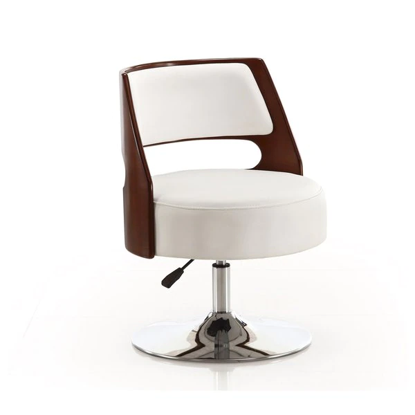 Design comes full circle. Ultra-versatile and incredibly stylish, this chic swivel chair will instantly dress up any space in your home. Well padded and upholstered in snowy white Faux Leather, its round seat is encircled by a curved shell-style back boasting a rich wood grain. With its easily adjustable height and 360 degree swivel capability, its refined armless design provides superior mobility, beautifully functional for home offices, living spaces, or dining areas.