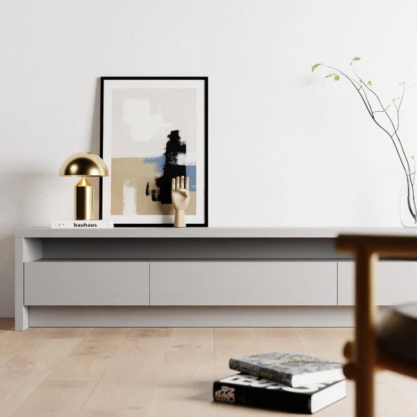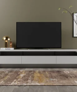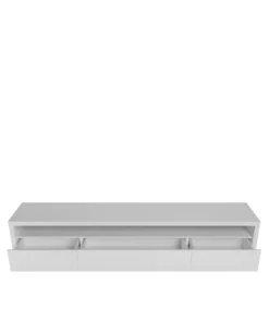 Modern Free Standing TV Stand for Living Room and Bedroom use. * Upon Assembly, Measures: 85.03 in. Length, 18.3 in. Height, 17.32 in. Depth. * Recommended for a 60" TV Screen * Includes 3 Full Extension Drawers and 1 Long Shelf For Media Devices. * Long Shelf Features 3 Media Holes for Wire and Cable Management. * Sleek Beveled Drawer Handless Design. * Made of High Quality MDF with Painted Smooth Gloss and Pro Touch – Wooden Grain Felt Finish. * Home Assembly Required. All Hardware Included.