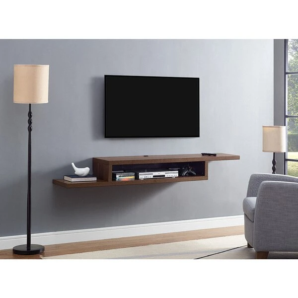 The colonel 72" wall mount TV console has a modern flair with the appearance of a floating shelf and a unique asymmetrical design. Finished in a laminated wood tone with black accents, this bold design is functional and visually striking. The shelf is designed to hold audio/video component along with a sound bar in the top shelf. It holds up to 70 lbs. And comes with mounting hardware for standard wood stud wall installation. The wall mounted console boasts concealed wire management and assembles in minutes.