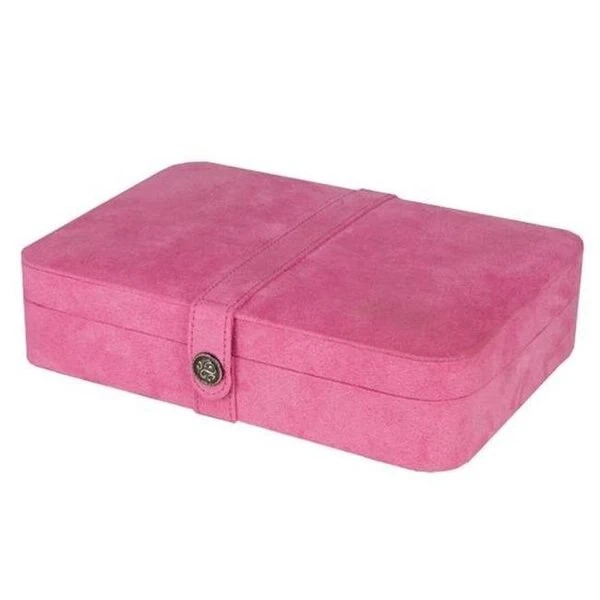 Mele Jewelry Box continues to be the most desired name in jewelry cases throughout the world. We infuse the heritage of our family into each of our jewelry boxes and continue to offer you innovative and timeless designs for years of happiness and sentimental memories. Mele & Co. fashion jewelry box. Plush fabric in Rose Blush. Mirror and shirred catch pocket on interior lid. Box is divided up into twenty four equal sections. Ivory sueded fabric lining. Tabbed closure with antiqued pewter snap. 10 3/8" x 2 3/8" x 7 1/4". Made in China 10 3/8" x 2 3/8" x 7 1/4"