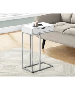 Tired of holding a beverage in your hand and a bowl of popcorn in your lap while binge watching? This C table keeps them within easy reach so you can sit back and enjoy the show. The C-shaped base slides under your sofa or chair, placing the table surface close to you. For added convenience, the top includes a storage drawer that is accessible from both sides. Use it to hide away mobile devices to avoid interruptions while you're watching TV, then store remotes in it when you're done. Stylish and versatile, this portable accent table features a top in a smooth, white laminate finish and a metal frame in silver that adds a modern look wherever you need a small side table with storage.