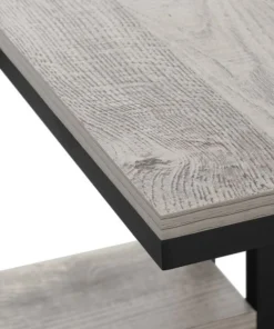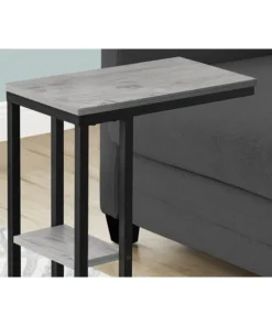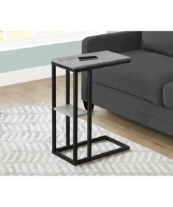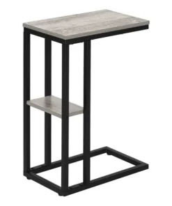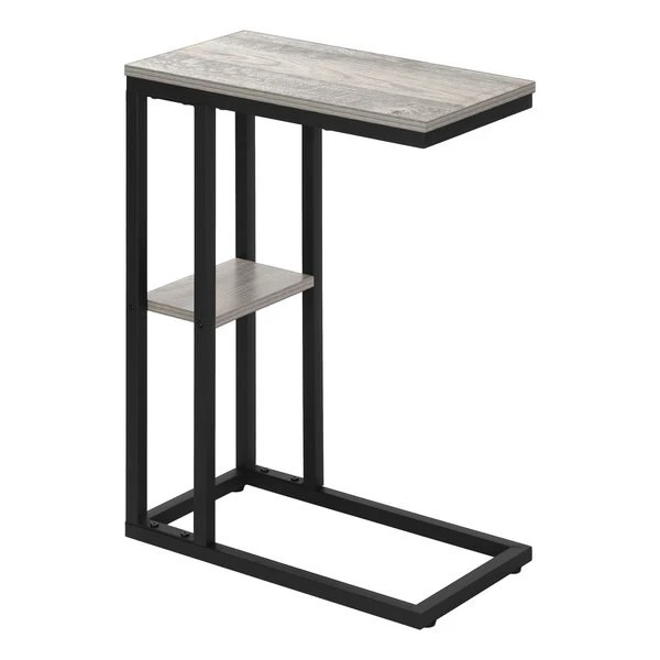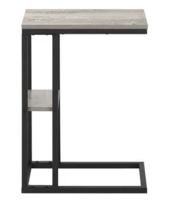Straight lines and clean angles give this C-shaped accent table an elegantly modern look. The rectangular tabletop in a grey wood-look finish is supported by a black metal frame with a secondary shelf underneath the table for convenient placement of smaller items. Slide this versatile end table under a sofa or chair to place snacks or mobile devices or use as a side table next to a bed.
