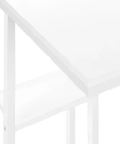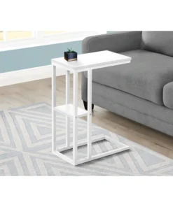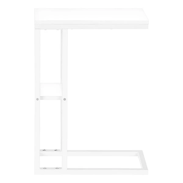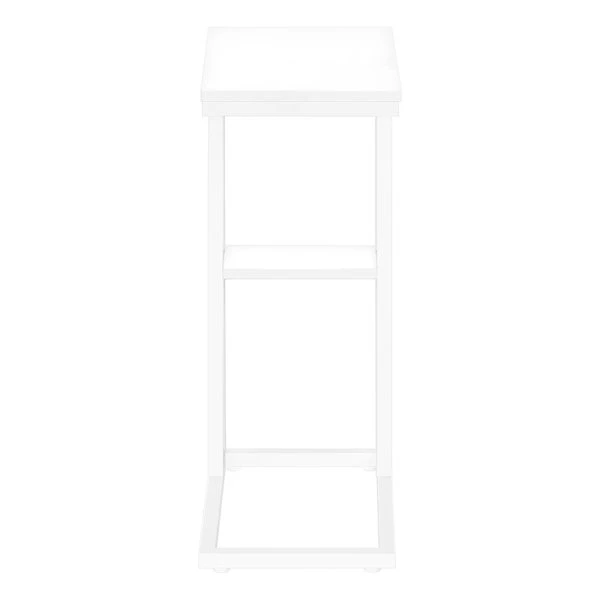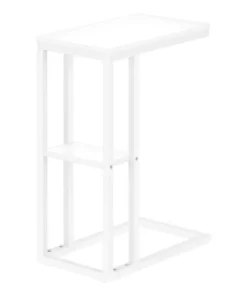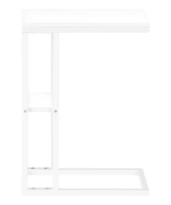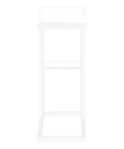 Straight lines and clean angles give this C-shaped accent table an elegantly modern look. The rectangular tabletop in a white finish is supported by a white metal frame with a secondary shelf underneath the table for convenient placement of smaller items. Slide this versatile end table under a sofa or chair to place snacks or mobile devices or use as a side table next to a bed.
