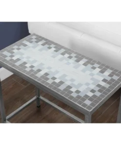 Reach your design goals in your living room, bedroom or lounge. Slide this end table next to you, cozy up and watch your favorite movie or show. The grey and blue tile table-top design features a spacious surface area to easily hold your drinks or decor accessories. Ideal for small apartments or condos where space is a challenge, the table also is also constructed with a hammered silver reinforced base for extra support.