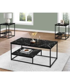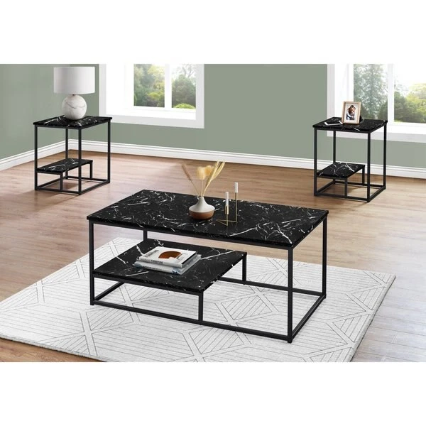 Bring a fresh modern update to your living space with this unique 3 piece coffee table set. The simple contemporary design in an elegant black marble-look finish and accented with a black metal trim, provides a spacious table top with a raised bottom half shelf for additional storage and display. The matching end tables are perfect to place a lamp, pictures, or other decorative objects while the coffee table will be an attractive focal point in your living room, den, or family room.