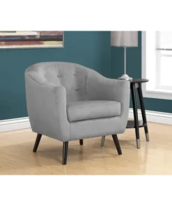 Add some retro glam to a room with this gorgeous barrel style chair upholstered in a smooth and rich grey velvety fabric with a subtle mosaic texture. The classic tufted seat back, long elegant curved arms, and generous thick cushioned seat, all supported on rounded black solid wood legs, makes this accent chair a standout in a living room, bedroom, or entryway whether your style is contemporary, eclectic, or traditional. . Upholstered accent chair in an elegant grey, mosaic velvet-look fabric that adds some retro glam to your living space. Thick, firm cushioned seat with a curved tufted back. Living room chair features solid wood legs in black. This barrel style sofa chair can be placed in the living room, bedroom, or entryway. Product Dimensions: 30"L x 32"W x 32"H