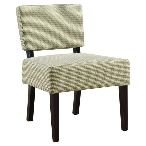 Combining contemporary lines and retro style, this versatile accent chair will bring sophistication to any room. It features sturdy, solid wood legs and exposed backrest supports in a black finish that provide an interesting visual contrast next to the soft fabric with an abstract dot pattern in light and dark green. With a deep, extra-wide seat and gently curved backrest that offer maximum comfort, this upholstered armless chair makes a great guest chair or slipper chair in a living room or bedroom.