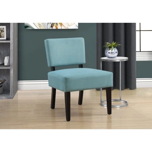Combining contemporary lines and retro style, this versatile accent chair will bring sophistication to any room. It features sturdy, solid wood legs and exposed backrest supports in a black finish that provide an interesting visual contrast next to the soft, teal fabric. With a deep, extra-wide seat and gently curved backrest that offer maximum comfort, this upholstered armless chair makes a great guest chair or slipper chair in a living room or bedroom.. Upholstered armless accent chair in a teal fabric. Cushioned backrest and deep, wide seat with extra padding for comfort and support. Squared solid wood legs and backrest supports in a black finish provide stability. Assembly required: All parts are located underneath the seat cushion; illustrated instructions are provided for convenience (additional tools may be needed). Product dimensions: 22.75 inches L x 27.5 inches W x 31.5 inches H