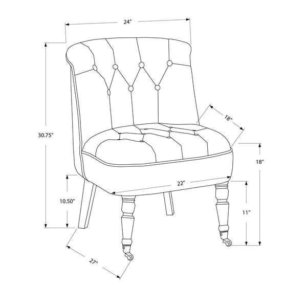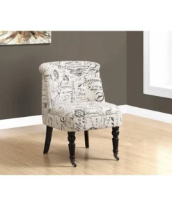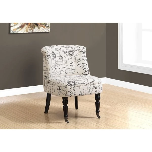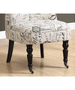 Bring some nostalgia and charm to your home with this elegant traditional style accent chair. It features a curved, tufted and padded scroll back design for comfort with a wide cushioned seat. The front black solid wood turn-post legs with wheels, provides easy mobility and add to the classic design. This armless slipper chair is further complimented with a beautiful vintage off-white and black French script printed linen blend fabric for a fresh update. Imagine how this lovely accent chair will give that extra special boost to your living room, bedroom, den, or entry way décor.