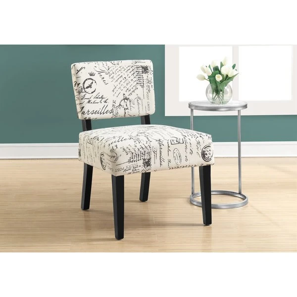 Combining contemporary lines and retro style, this versatile accent chair will bring sophistication to any room. It features sturdy, solid wood legs and exposed backrest supports in a black finish that provide an interesting visual contrast next to the beige fabric with a vintage French print. With a deep, extra-wide seat and gently curved backrest that offer maximum comfort, this upholstered armless chair makes a great guest chair or slipper chair in a living room or bedroom.. Upholstered armless accent chair in a vintage French print fabric. Cushioned backrest and deep, wide seat with extra padding for comfort and support. Squared solid wood legs and backrest supports in a black finish provide stability. Assembly required: All parts are located underneath the seat cushion; illustrated instructions are provided for convenience (additional tools may be needed). Product dimensions: 22.75 inches L x 27.5 inches W x 31.5 inches H