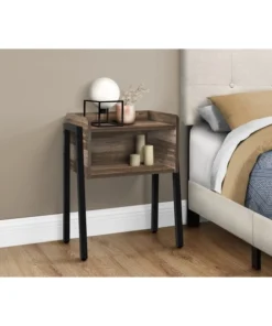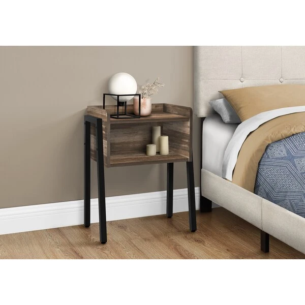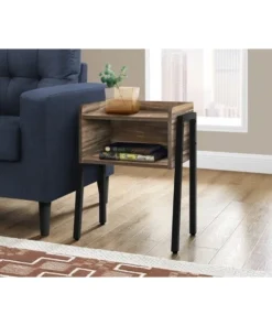 Save space while providing the perfect sidekick to any furniture ensemble. This end table, featuring a reclaimed look finish in brown, is equipped with an open shelf and modern black metal legs to complete the industrial-inspired design. Made for showing off your favorite decor items or storing books in the living room or family room, this side table can also be used as a bedside table. It is an on-trend piece that is waiting to be added to any living space. Assembly is required.. Sleek and airy side table with an open shelf cubby for the display or storage of books, photo frames and other decorative objects. This rectangular end table features a smooth brown reclaimed wood look on all sides. Perfect multi-use display unit for the living room, bedroom, family room, or as a nightstand/lamp table. This small modern accent table is supported by sturdy black metal legs.