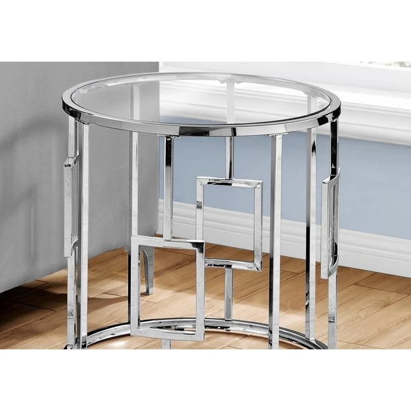 If you want a unique accent piece to complement your living room or bedroom, then look no further than this elegant round side table with a stunning drum shaped base in an open Greek key design. The spacious tempered glass top is large enough to place a lamp, decorative item, or a drink, while the chrome finish on the sturdy metal base will bring that wow factor to your decor. The size of this end table is perfect even for small spaces, with its modern glam appeal, and it is versatile enough to bring it into the bedroom as a chic nightstand. Assembly is required.. Versatile, contemporary style round metal side table with a chic glam vibe. Thick, clear tempered glass top with plenty of space for a lamp, book, or a place for your drink. Strong, round drum base with an open, modern Greek key graphic design in a compact size end table. Elegant chrome metal finish for an eye-catching appeal.