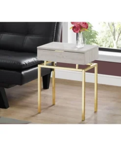 Add a bold statement to your living room or bedroom with this modern accent end table. The rectangular and spacious table top laminated in a beige marble look, made from high quality MDF material features one large storage drawer on metal glides with a discreet gold metal handle. The standout for this table has to be the gold metal base with a minimalist yet artistic design. This multifunctional table works just as well in a modern bedroom setting as a nightstand or placed next to a contemporary style sofa or chair in a living room. Assembly is required.. Spacious rectangular table top finished in a smooth beige marble look. One large storage drawer with a simple gold metal drawer pull. Bold and modern architectural gold metal base. Versatile accent furniture to use as an end table or nightstand.