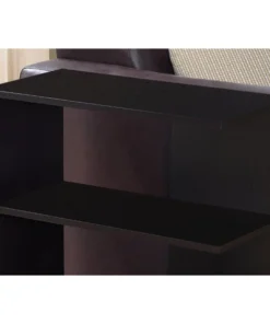 This simple rectangular side table with open storage shelving in a contemporary design brings style and function to any room. It starts with a smooth laminated espresso finish on all sides on a sturdy elevated base. The spacious tabletop can hold a small lamp, place your drink or set down your tablet or book. The two open shelves with a partial back panel are perfect to store books, magazines, or gaming consoles. So versatile, this accent table can also be placed in a bedroom as a nightstand as well as a side or end table in your living room or family room. Assembly is required.. Plenty of storage space with 2 large open shelves. Elevated base for height and stability. Compact contemporary design ideal for small spaces. Finished in an elegant laminated espresso on all sides.