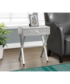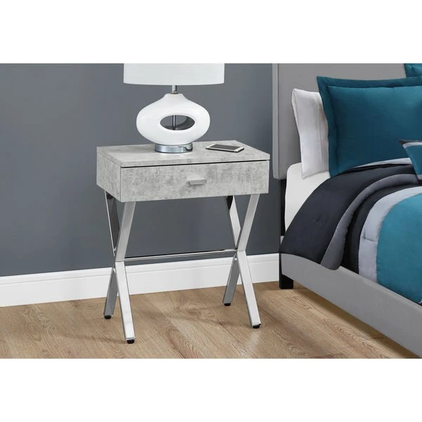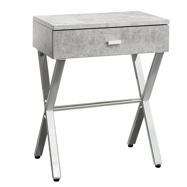 For a brilliant home upgrade, this cement finished side table does the trick (and more!). Supported by an elegant chrome metal base, the end table is made for anything from snacks and drinks to your laptop, tablet and even decorative accents that complement the rest of your decor. Bringing a modern touch to your small home, condo or apartment, this table slides nicely next to the couch or bed. Study session? Favorite movie? Quiet reading time? This side table handles all of the above and some extra storage thanks to a convenient legal/letter-sized storage drawer.. This grey side table is finished in a cement look with a luxurious chrome metal X base frame . Elevate the modern tone of your living room, family room, office space, bedroom or den . Use it conveniently as an accent table or nightstand . Solid X design frame delivers the stability and elegance you need .
