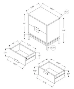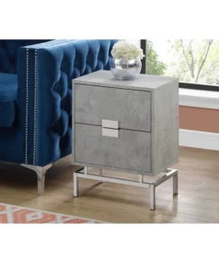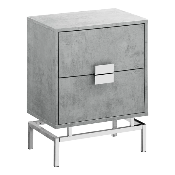 This retro inspired side/end accent table gives a modern glamorous look to a room. Finished in a stylish laminated grey cement-look on all sides, with two large storage drawers on metal glides accented with chic silver metal drawer pulls that meet together as one. The bold yet simple silver chrome metal base elevates this accent table to another dimension. Versatile to use as a nightstand for a modern bedroom or next to a sofa or chair as a side table, this is one statement making accent furniture piece. Assembly is required.. Spacious rectangular table top in a modern grey cement-look finish. Two large storage drawers with unique silver metal drawer pulls. Chrome silver metal base in a clean modern design. Versatile and compact to use as an end table or nightstand.
