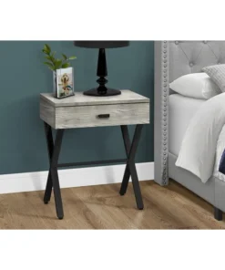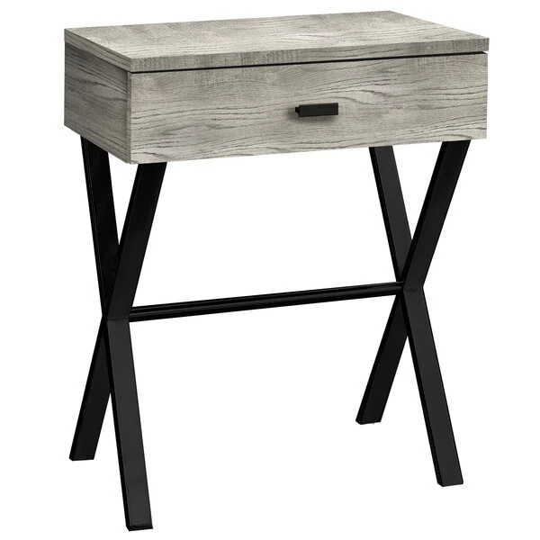 For a brilliant home upgrade, this grey reclaimed wood look side table does the trick (and more!). Supported by an elegant black metal base, the end table is made for anything from snacks and drinks to your laptop, tablet and even decorative accents that complement the rest of your decor. Bringing a mid-century touch to your small home, condo or apartment with a rustic wood look, this table slides nicely next to the couch or bed. Study session? Favorite movie? Quiet reading time? This side table handles all of the above and some extra storage thanks to a convenient legal/letter-sized storage drawer.. This grey side table is finished in a reclaimed wood look with a luxurious black metal base. Elevate the mid-century tone of your living room, family room, office space, bedroom or den with this rustic wood-look end table. Use it conveniently as an accent table or nightstand. Solid X design frame delivers the stability and elegance you need.