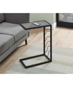 Straight lines and subtle curves give this C-shaped accent table an elegant, contemporary look. The rectangular tabletop in a textured, grey stone-look finish is bordered by a black metal frame that extends down to the base. A wave pattern design on the frame adds a decorative touch. This versatile end table is ideal for living rooms or bedrooms as a convenient surface to place items like a small clock, remote, or mobile device.. C-shaped accent table with a base that can be slid underneath sofas for convenience. Rectangular tabletop in a textured, grey stone-look finish. Black metal frame with wave pattern design. Assembly required: Illustrated instructions and all hardware are provided for convenience (additional tools may be needed).