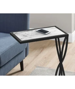 Straight lines join with sleek curves to give this C-shaped accent table a sophisticated look. The rectangular white marble-look tabletop is bordered by a black metal frame that extends down to the base. The geometric flower petal design of the frame adds a decorative touch. This versatile end table is ideal for living rooms or bedrooms as a convenient surface to place items like a small clock, remote, or mobile device.. C-shaped accent table with a base that can be slid underneath sofas for convenience. Rectangular tabletop in a non-glossy, white marble-look finish. Black metal frame with a geometric flower petal design. Assembly required: Illustrated instructions and all hardware are provided for convenience (additional tools may be needed).