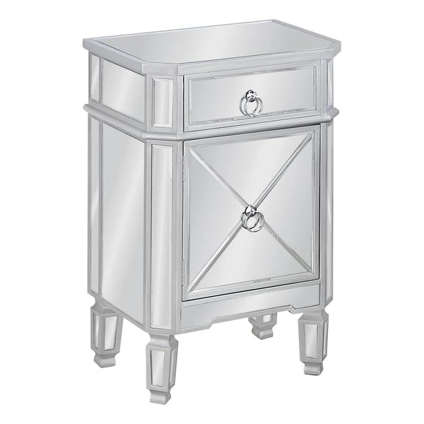 This mirrored accent table has a glamourous look that is always in style. Mirror insets on the top, front, sides, and tapered feet are bordered by a shimmering silver finish. The mirrored surfaces reflect light and the surrounding décor to blend beautifully in a living room or bedroom and make the room appear bigger. Adding to its elegance are silver metal ring pulls, clipped front corners, and sculpturesque block feet. The storage drawer is lined with black fabric and includes a stopper to help prevent it from falling when opened. Concealed by a door with X-shaped beveling is a spacious, silver-finished cabinet. Use this side table or nightstand to bring glam style to any room.